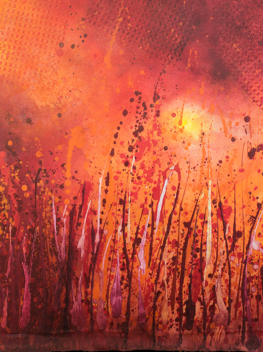 Puesta de la obraPuesta de la obraObra abstracta formada por tramas, manchas y líneas que se superponen dando la sensación de que el cuadro no tiene límites al extenderse sobre todo el espacio de la tela. Composición libre de trazos enérgicos, trabajada sobre el lienzo sin tensar, técnica denominada dripping.