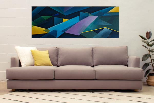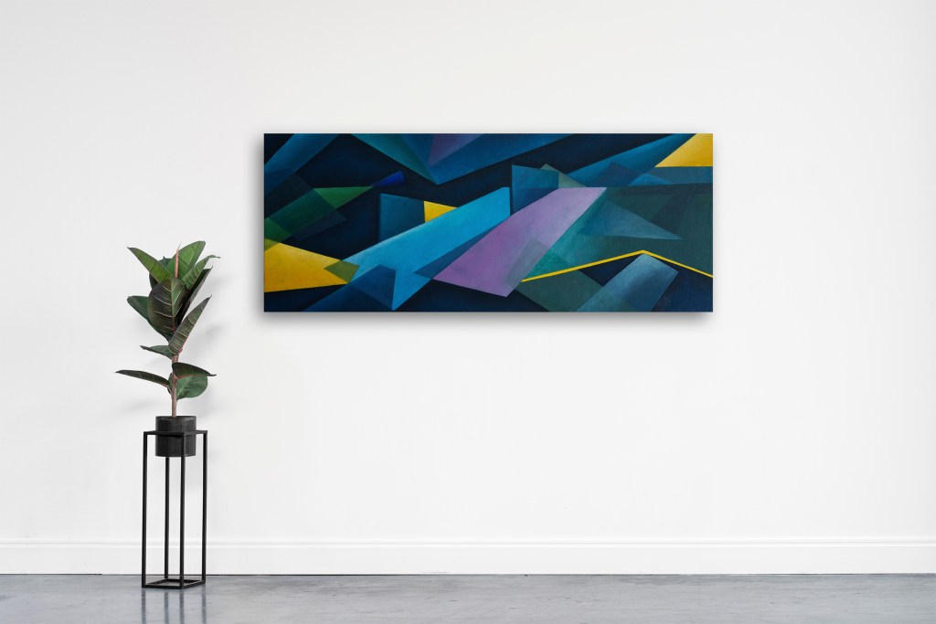 Puesta de la obraPuesta de la obra Es una obra geométrica que genera profundidad a través de los planos superpuestos. De colores profundos, parece suspenderse en el espacio, jugando con las transparencias.