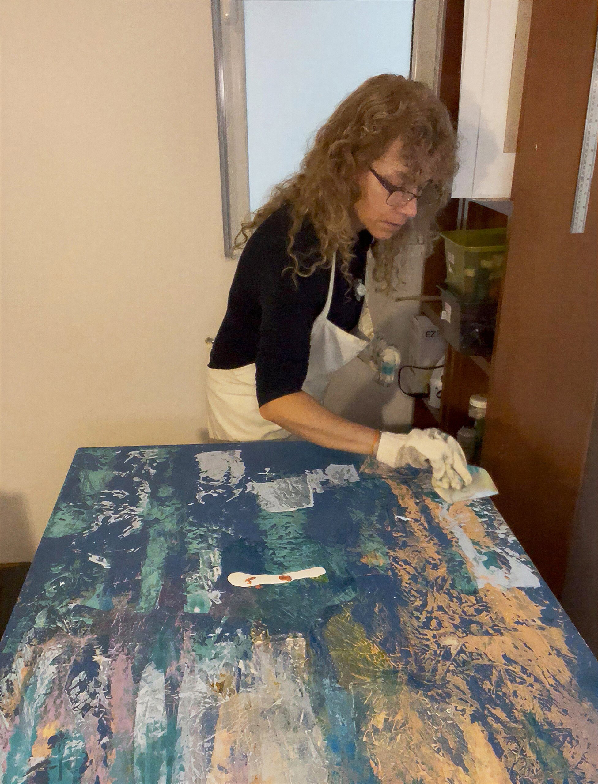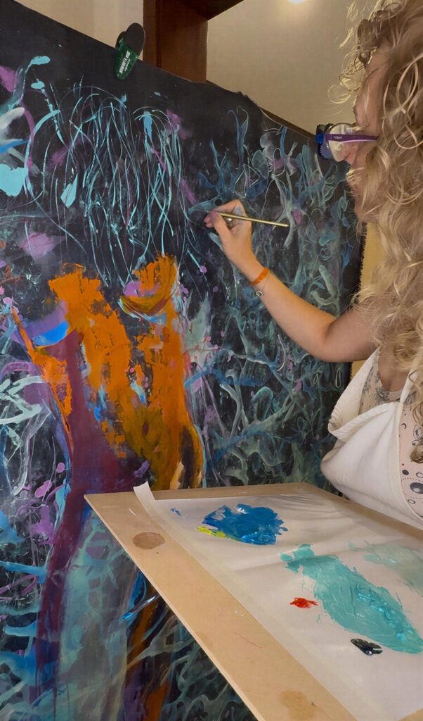 Su práctica artística se centra en la exploración y combinación de técnicas de estampas, monocopias y pinceladas, creando obras que capturan la esencia efímera del momento y la profundidad de la expresión individual.